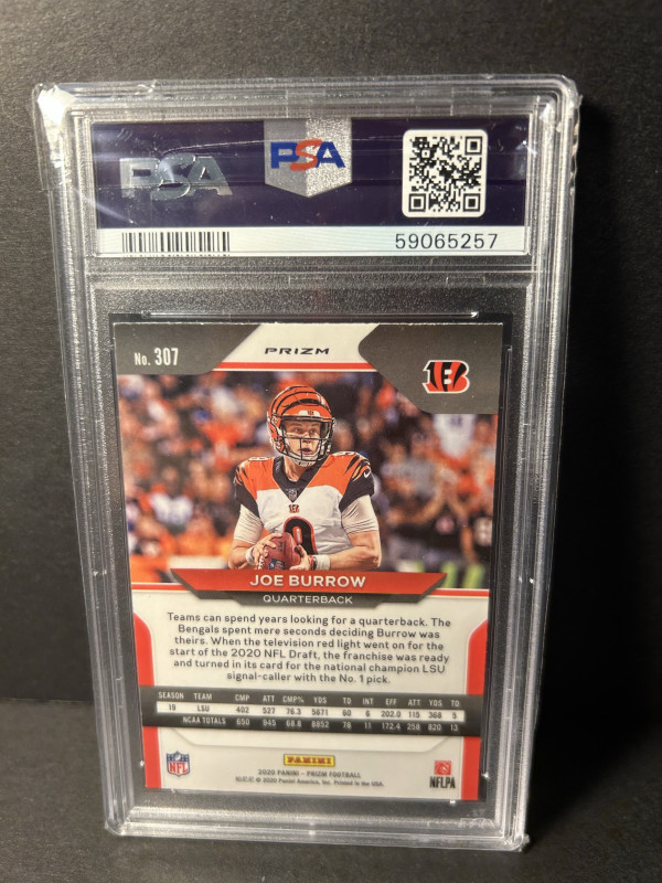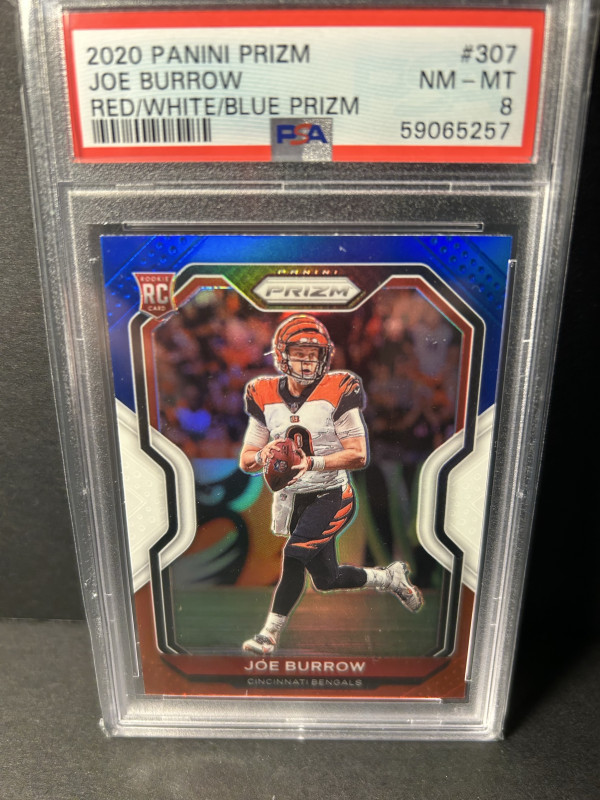 Up for sale is Cincinnati Bengals all pro quarterback Joe Burrow this card is a 2020 Panini prism #307 Parallel Red White & Blue ..