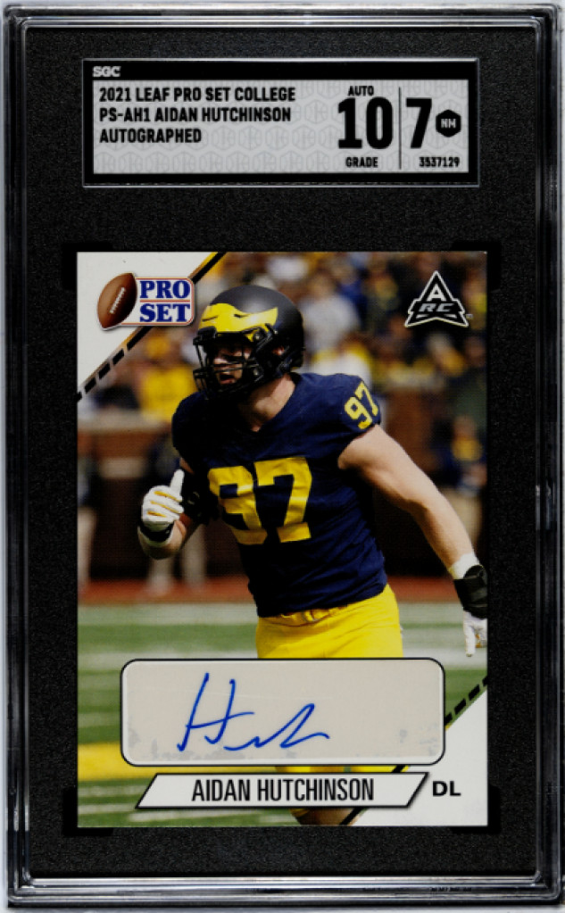 The 2021 Leaf Pro Set College Autographs Aidan Hutchinson #PS-AH1 trading card is a rookie insert featuring the talented football player. Graded with a 7 by Sportscard Guaranty Corporation (SGC), this collectible card is part of the Autographs set manufactured by Leaf. With the card number PS-AH1, this sports trading card is a great addition for fans and collectors looking to add a piece of Aidan Hutchinson's college career to their memorabilia.