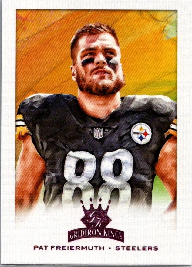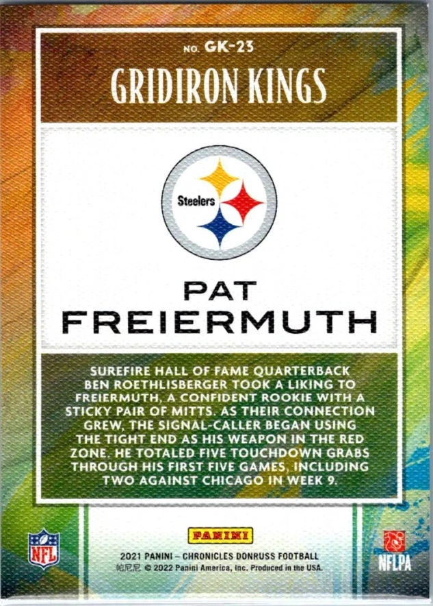 This is a nice example of a 2021 Panini Chronicles #GK-23 Pat Freiermuth Gridiron Kings Pink