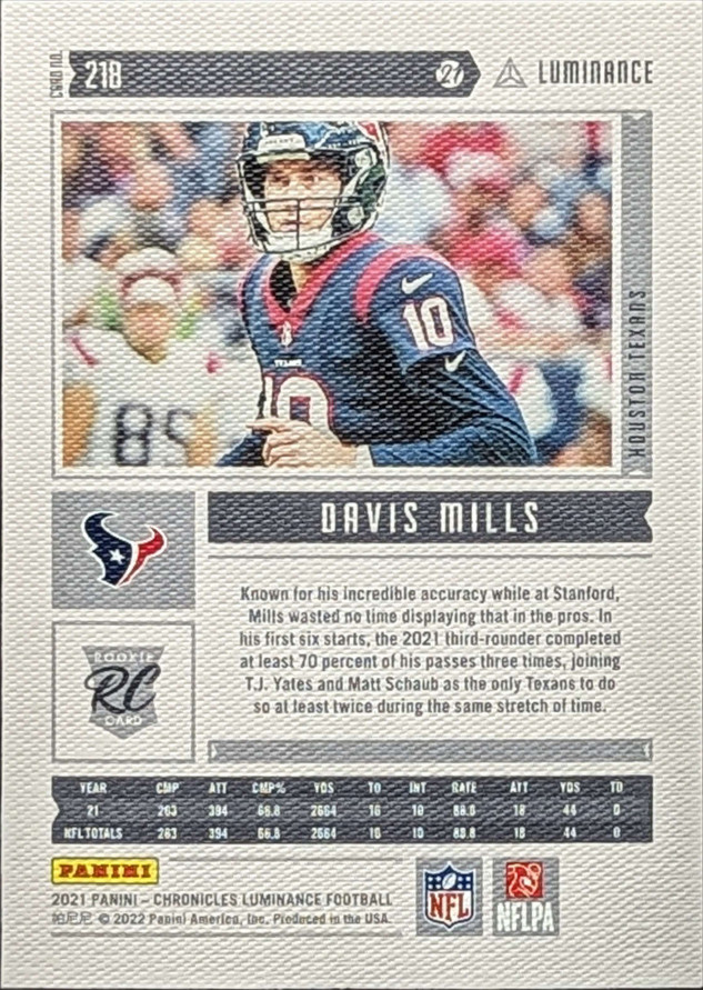 2021 Panini Chronicles Luminance Update Rookies Insert #218 Davis Mills Houston Texans RC