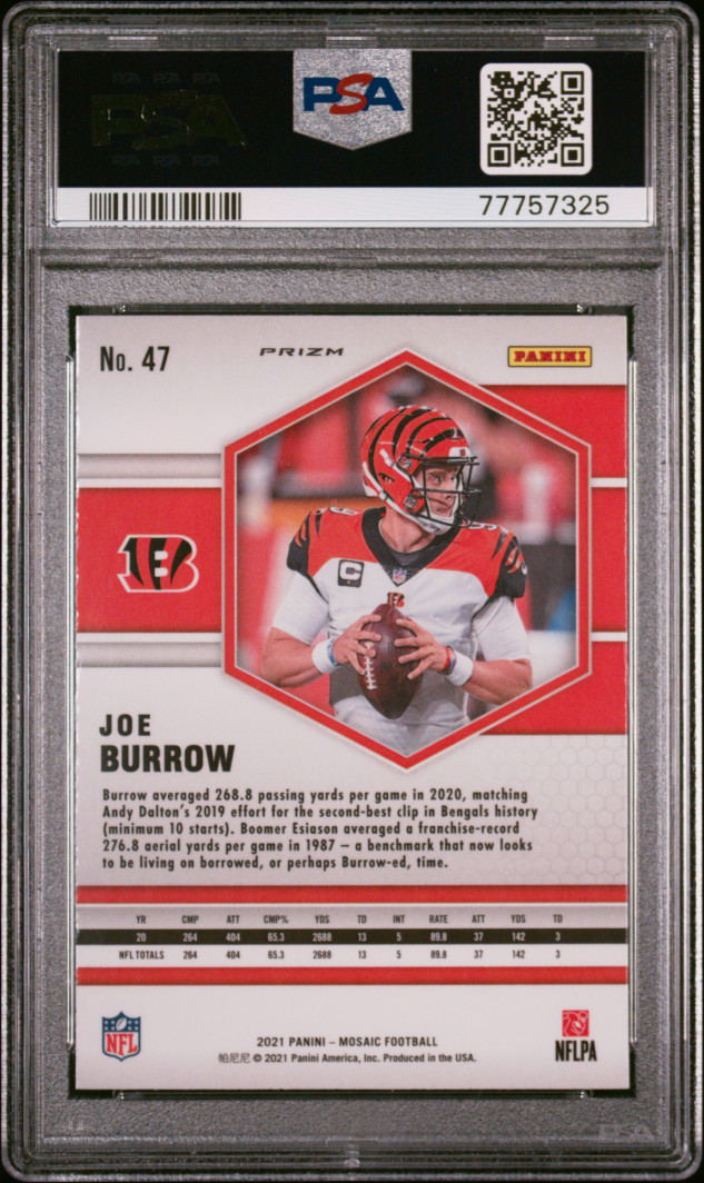 You are purchasing a 2021 Panini Mosaic Joe Burrow #47 PSA 10. You will receive the exact item in the photographs. Thank you for looking.