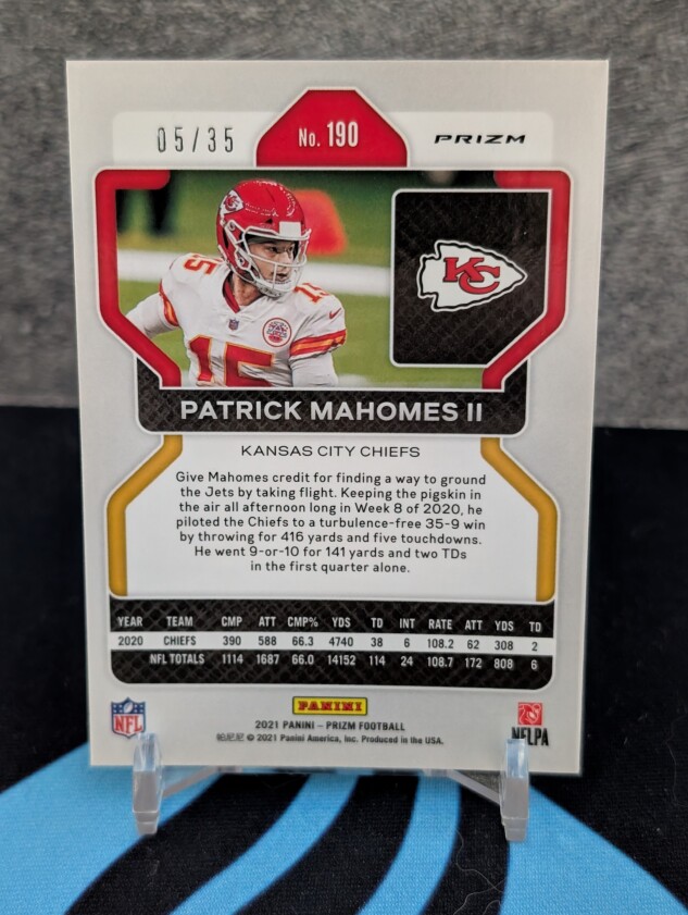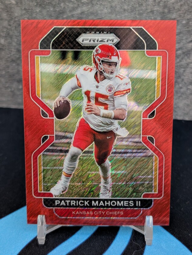 This is a 2021 Panini Prizm First Of The Line Red Shimmer Patrick Mahomes /35. The exact card is pictured.