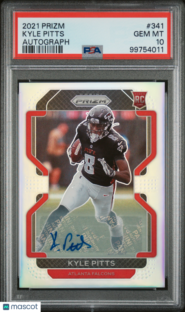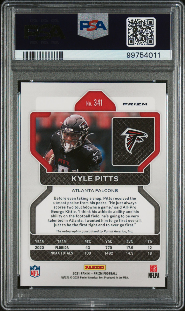 Don't miss your chance to own this stunning 2021 Panini Prizm Kyle Pitts #341 Autograph football card, graded a perfect PSA 10! Featuring a bold on-card signature from rising NFL star Kyle Pitts, this rare collectible is a must-have for any serious football card collector or Atlanta Falcons fan. With only 11 in existence and none graded higher, this card stands out as a true investment piece for your collection.