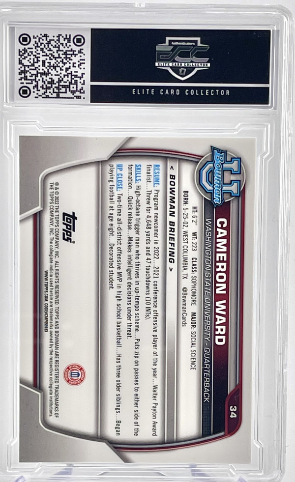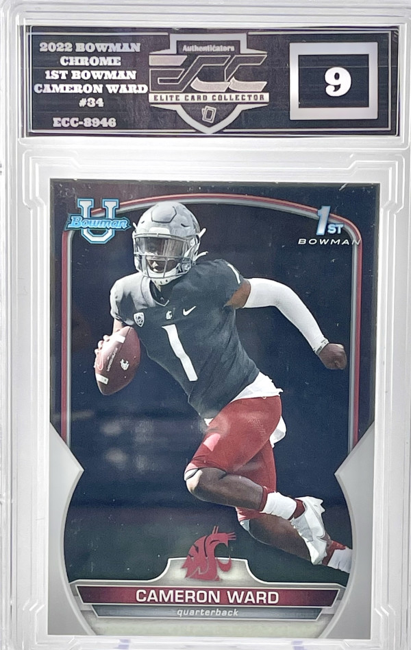 The product is a 2022 Bowman University Chrome trading card featuring Cam Ward of the Washington State Cougars football team. This rookie card is part of the base set and graded as a 9 by a professional grader. Manufactured by Topps, this sports trading card is a valuable addition to any collection for fans of NCAA football and collectors of sports memorabilia.