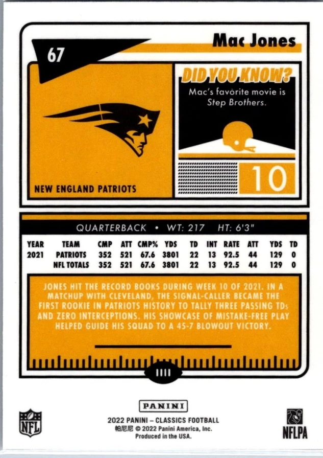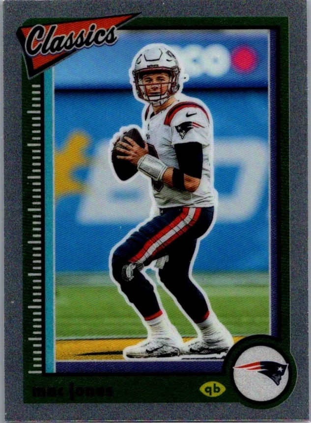 This is a nice example of a 2022 Panini Classics #67 Mac Jones Premium Edition Silver