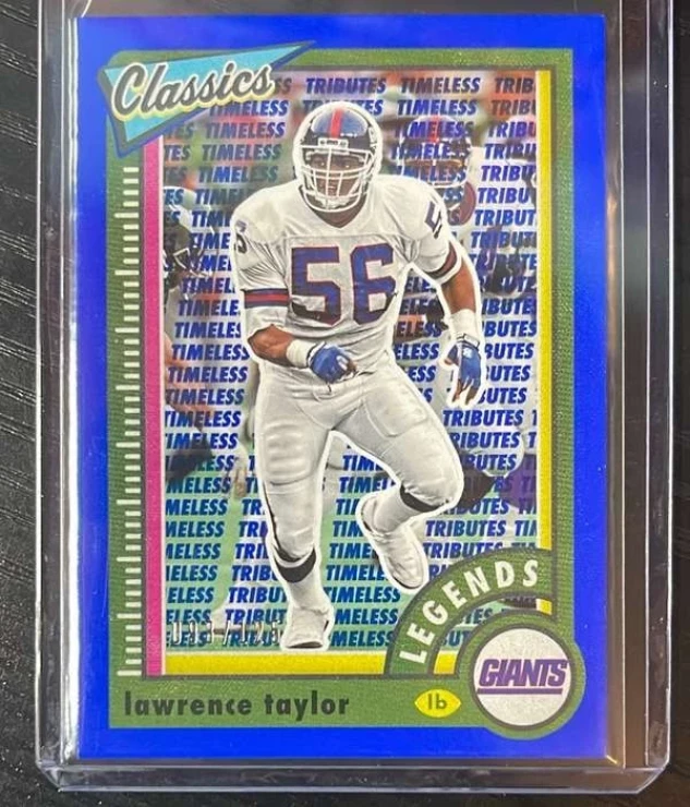 This is a nice example of a 2022 Panini Classics - Premium Edition Timeless Tributes Blue #129 Lawrence Taylor