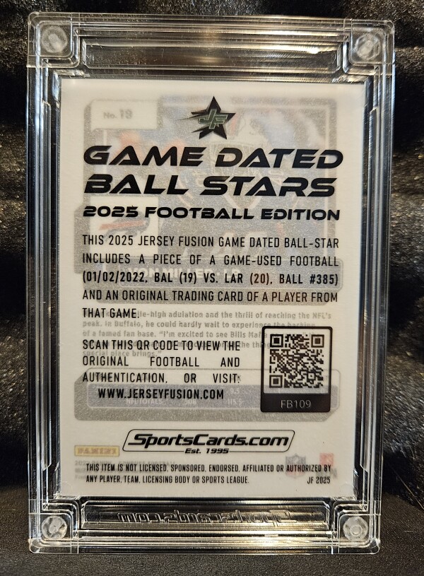2022 Panini Donruss Optic 1/38 Von Miller Gold Prizm, Game-Used Ball" relic, which is a physical piece of a football used in an NFL game embedded into the card with QR code proof of game ball use.