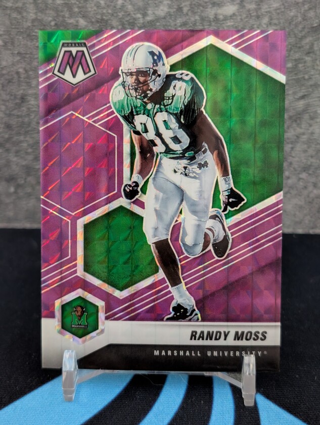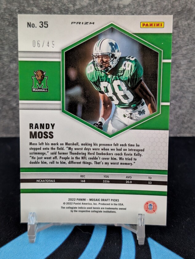This is a 2022 Panini Mosaic Draft Picks Football Randy Moss Purple /49. The exact card is pictured.