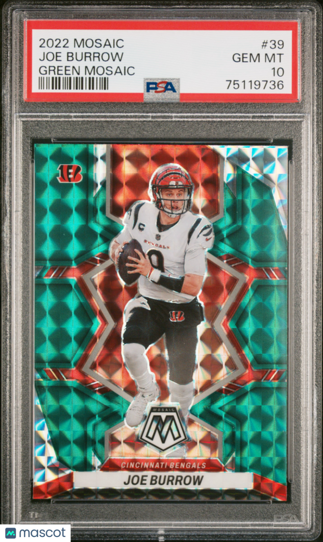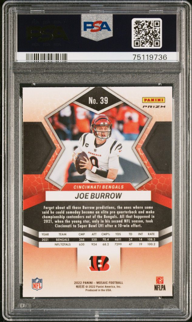 You are purchasing a 2022 Panini Mosaic Joe Burrow #39 PSA 10. You will receive the exact item in the photographs. Thank you for looking.