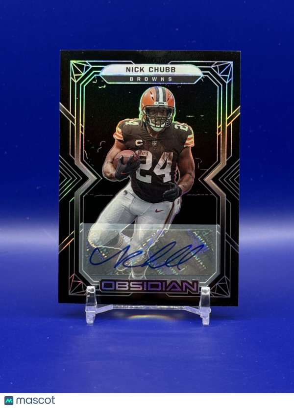 Don’t miss your chance to own this highly sought-after 2022 Panini Obsidian Nick Chubb autographed card, featuring the star running back of the Cleveland Browns! This limited edition collectible is a must-have for NFL fans and serious card collectors, showcasing Chubb’s authentic signature and premium Panini craftsmanship.
