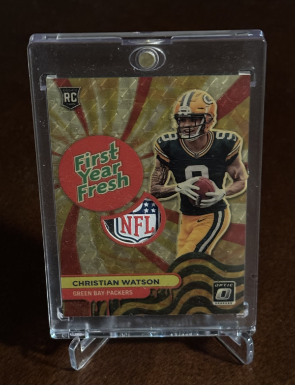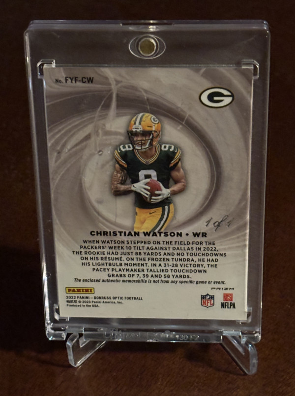 2022 Panini Optic First Year Fresh Christian Watson Gold Vinyl 1 of 1 NFL Shield.