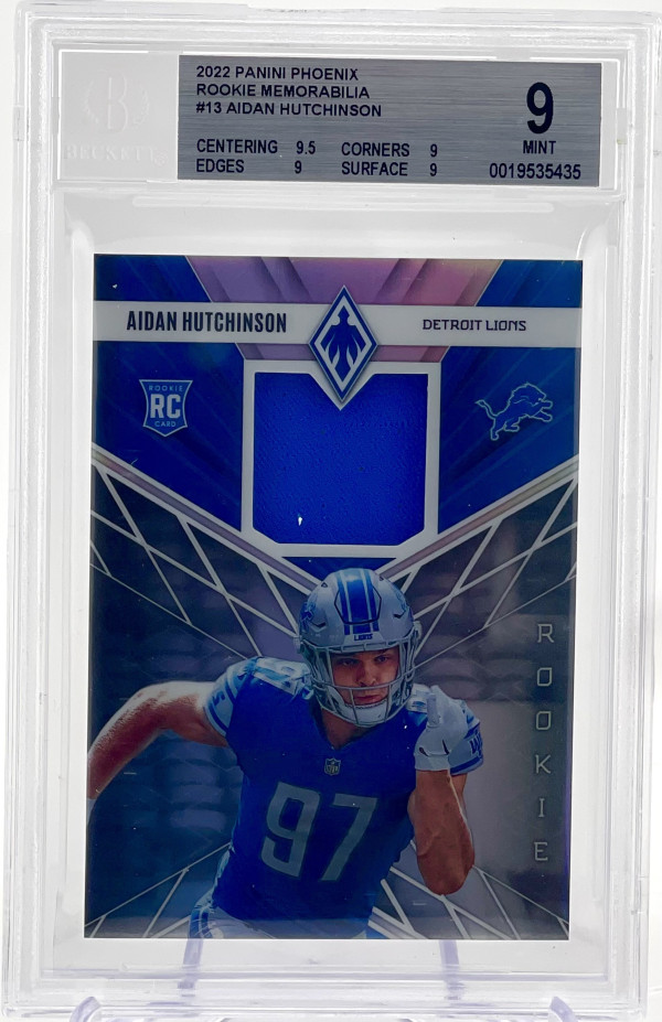 The 2022 Panini Phoenix Rookie Memorabilia #13 Aidan Hutchinson 144/149 trading card is a highly sought-after collectible for football fans. Signed by Aidan Hutchinson himself and authenticated by Panini, this card features a piece of memorabilia from the player, making it a valuable addition to any sports trading card collection. As a rookie card from the 2022 season, this card showcases the up-and-coming talent of Aidan Hutchinson, who is sure to make a splash in the NFL for the Detroit Lions. With only 149 cards in existence, this limited edition item is a rare find for collectors.
