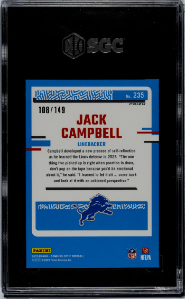 The SGC 2023 Donruss Optic #235 Jack Campbell Flex Prizm 108/149 trading card is a highly collectible item in the sports trading card world. This original NFL card features Jack Campbell of the Detroit Lions and has a grade of 10 from Sportscard Guaranty Corporation (SGC). Made of sturdy card stock with a thickness of 35 Pt., this rookie card from the 2023 season is a valuable addition to any football card collection. With its unique Optic parallel variety, this English-language card is a must-have for fans and collectors alike.