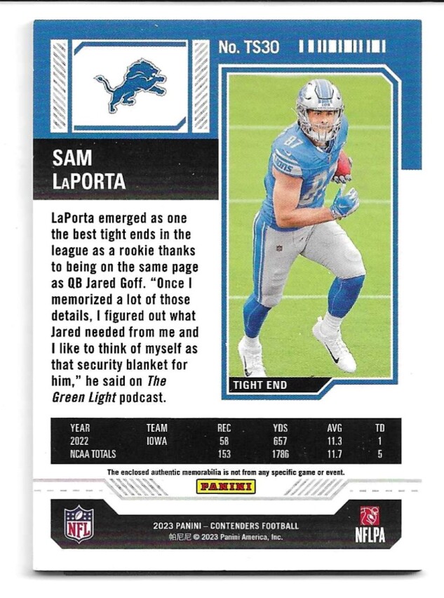 2023 PANINI CONTENDERS ROOKIE TICKET SWATCHES #TS30 SAM LAPORTA (RC)