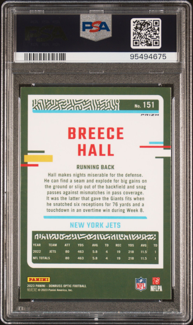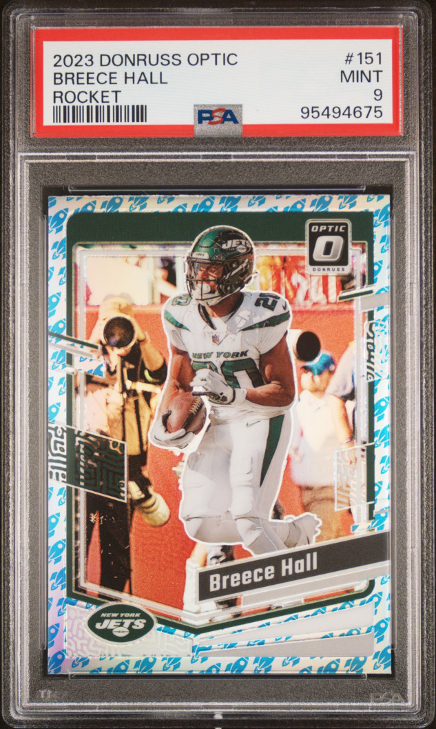 2023 Panini Donruss Optic Breece Hall #151 Rocket Emoji SP PSA 9