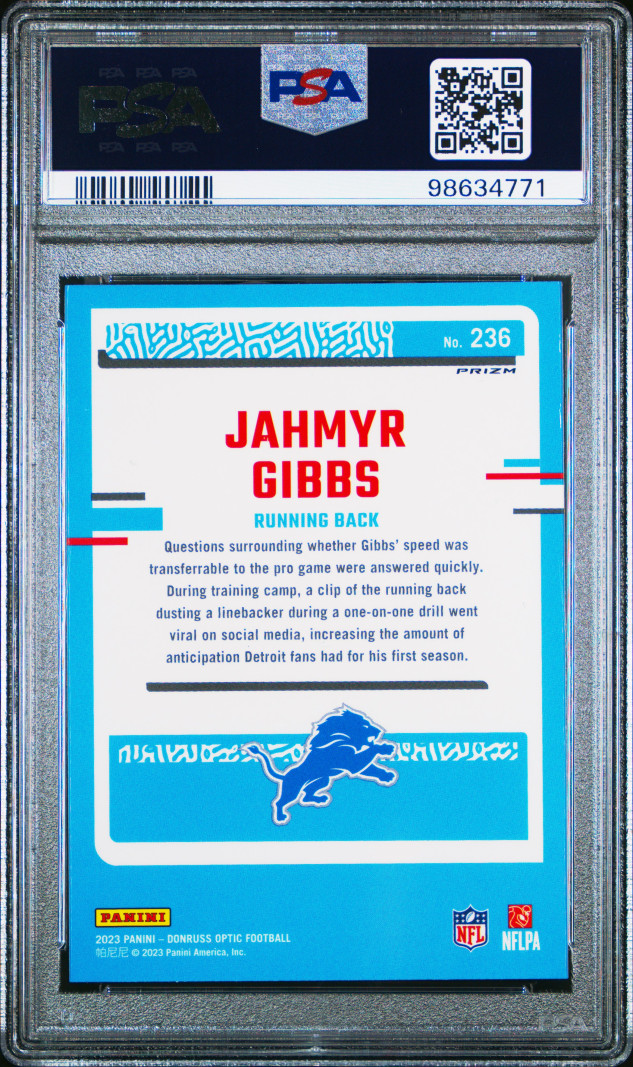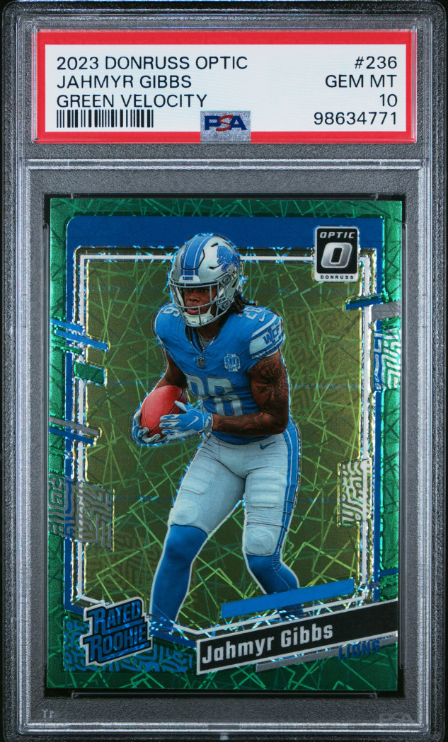 2023 Panini Donruss Optic Jahmyr Gibbs Green Velocity PSA 10