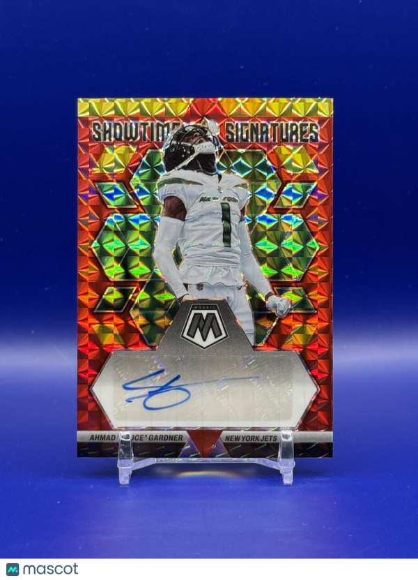 Score big with this rare 2023 Panini Mosaic Football Showtime Signatures card featuring Ahmad 'Sauce' Gardner of the New York Jets! This Choice Fusion Red and Yellow parallel is autographed by Sauce himself, making it a must-have for any NFL or Jets fan looking to add a standout piece to their collection. Don’t miss your chance to own a card that combines star power, eye-catching design, and authentic signature in one incredible collectible.