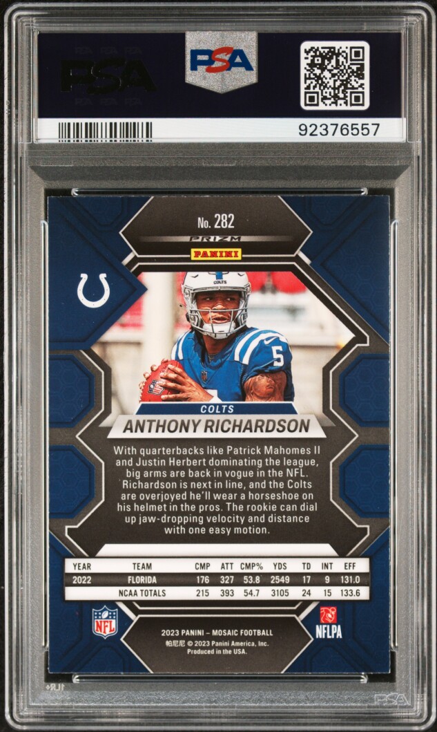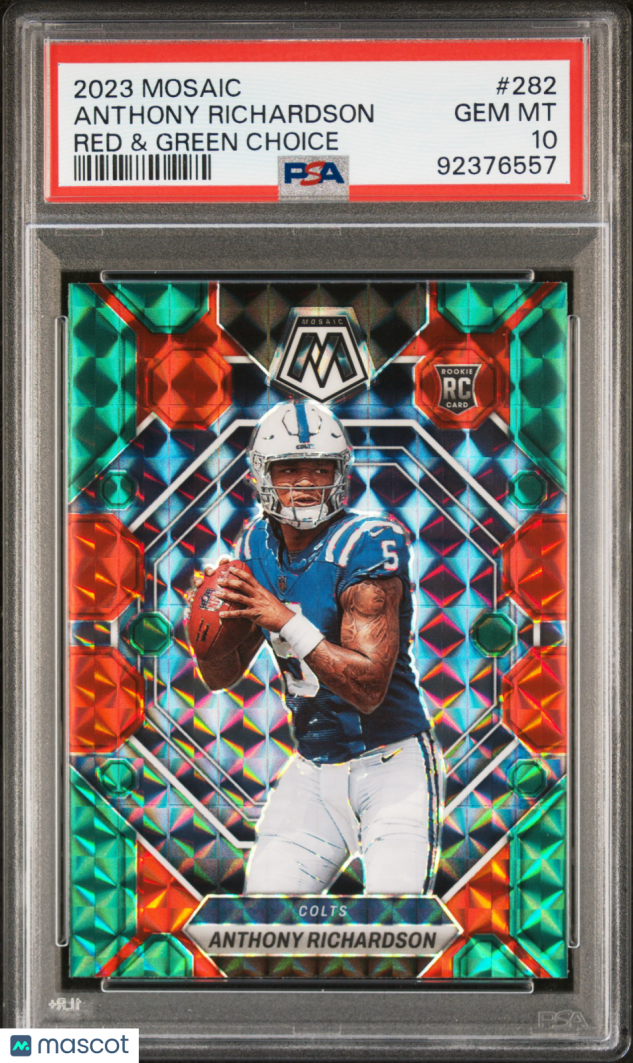 You are purchasing a 2023 Panini Mosaic Anthony Richardson #282 Red & Green Choice RC PSA 10. Thank you for looking.