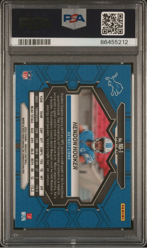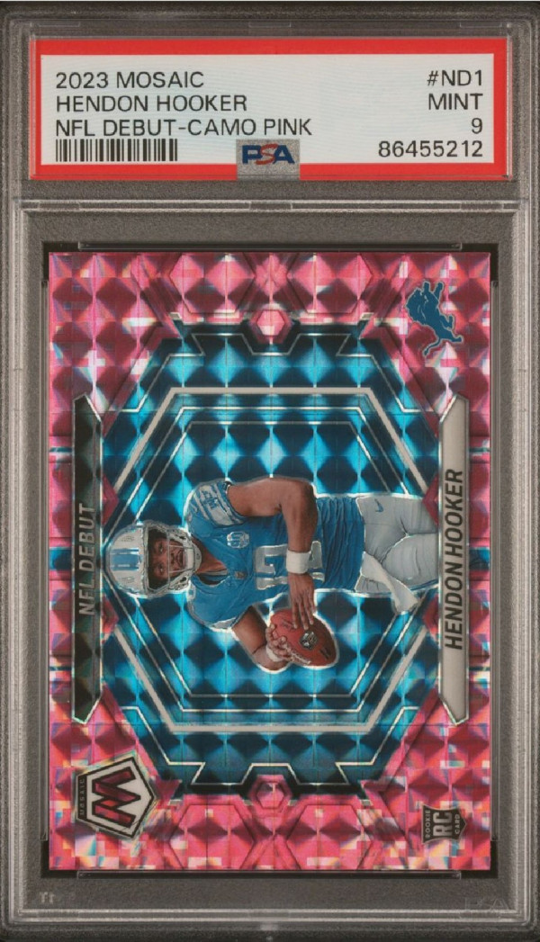 Thank you, check out my eBay site for references. Beautiful 2023 Mosaic Hendon Hooker Rookie NFL Debut Camo Pink - PSA 9 - #ND1. Domestic shipping only.