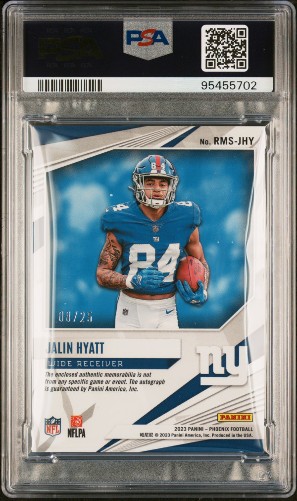 You are purchasing a 2023 Panini Phoenix Rising Rookie Material Signatures Jalin Hyatt #RMSJHY Rising RK Mat SIG Helmet Low Pop Short Print 8/25 Rookie PSA 8 Panini Authentic. You will receive the exact item in the photographs.