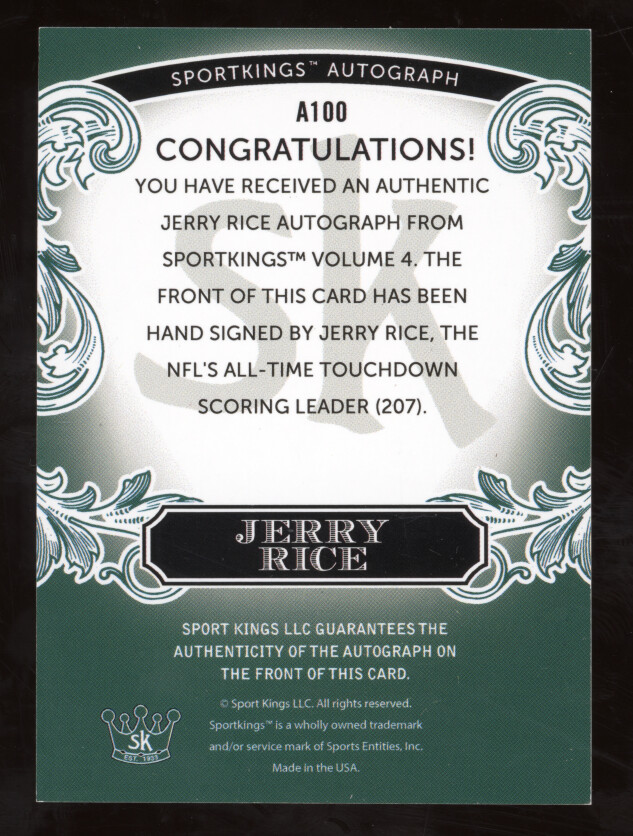 You are purchasing a 2023 Sportkings Series D Volume 4 Autograph Jerry Rice #A100 Green 2/5. You will receive the exact item in the photographs. Thank you for looking.