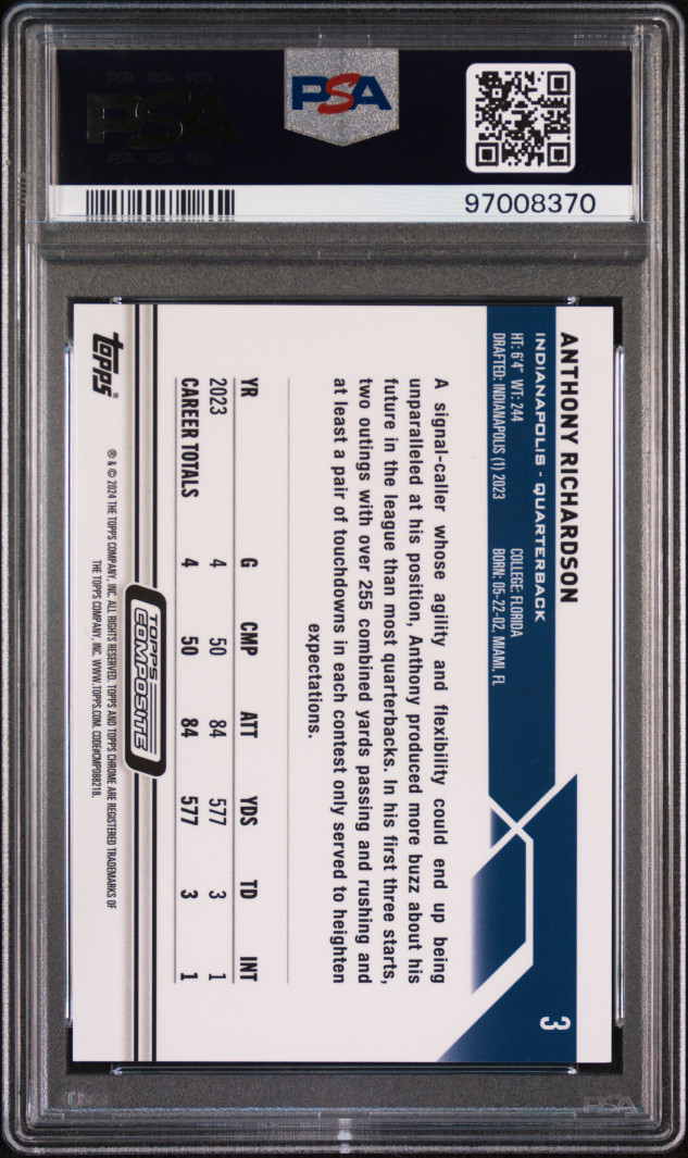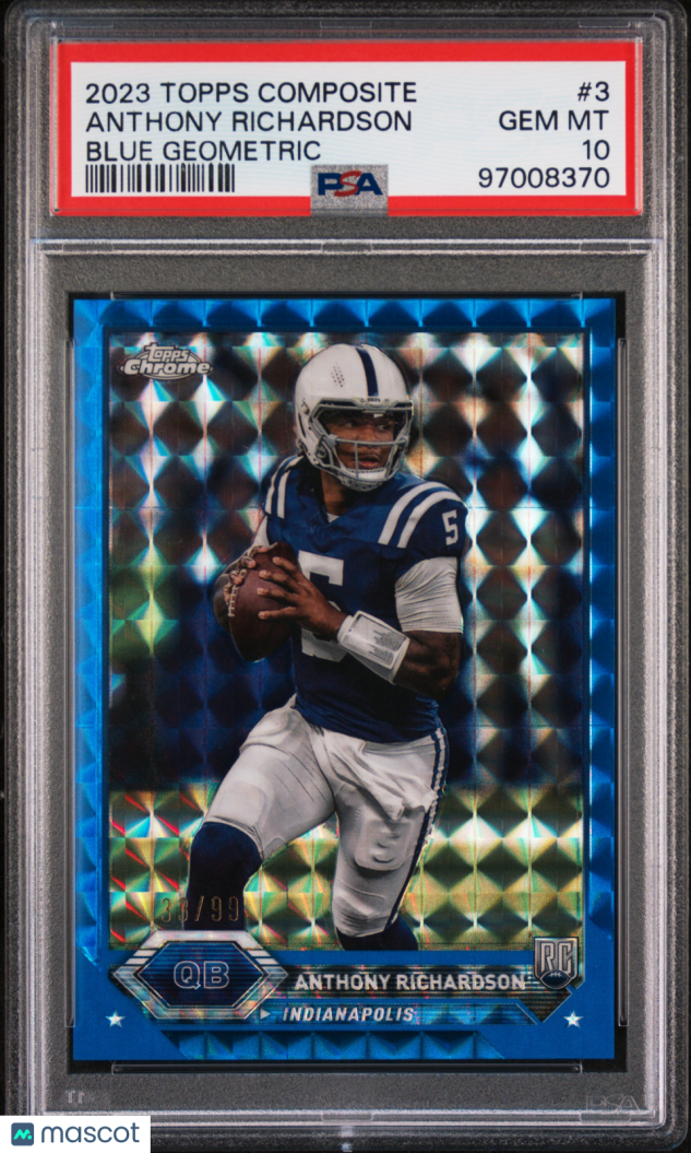 You are purchasing a 2023 Topps Composite Anthony Richardson #3 Blue Geometric PSA 10. You will receive the exact item in the photographs. Thank you for looking.