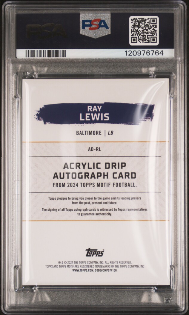 You are purchasing a 2023 Topps Motif Acrylic Drip Autographs Ray Lewis #ADRL Winsor Green 4/5 PSA 10. You will receive the exact item in the photographs. Thank you for looking.