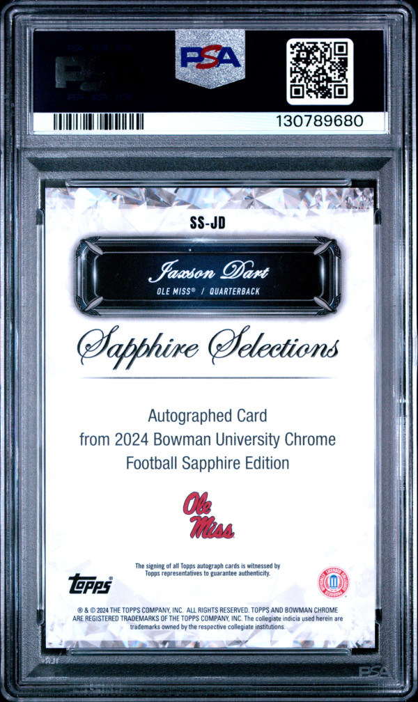 You are purchasing a 2024 Bowman Sapphire Jaxson Dart Orange Sapphire Selections Auto 8/25 #SSJD PSA 10. You will receive the exact item in the photographs. Thank you for looking.