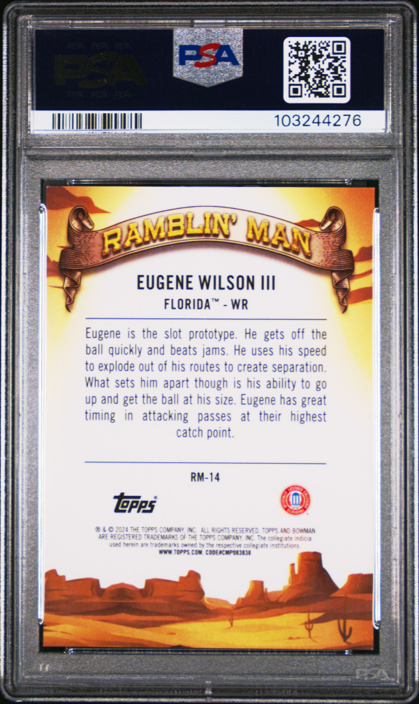 You are purchasing a 2024 Bowman University Chrome Ramblin' Man Eugene Wilson III #RM14 Orange Ref /25 Florida Gators PSA 9. You will receive the exact item in the photographs. Thank you for looking.