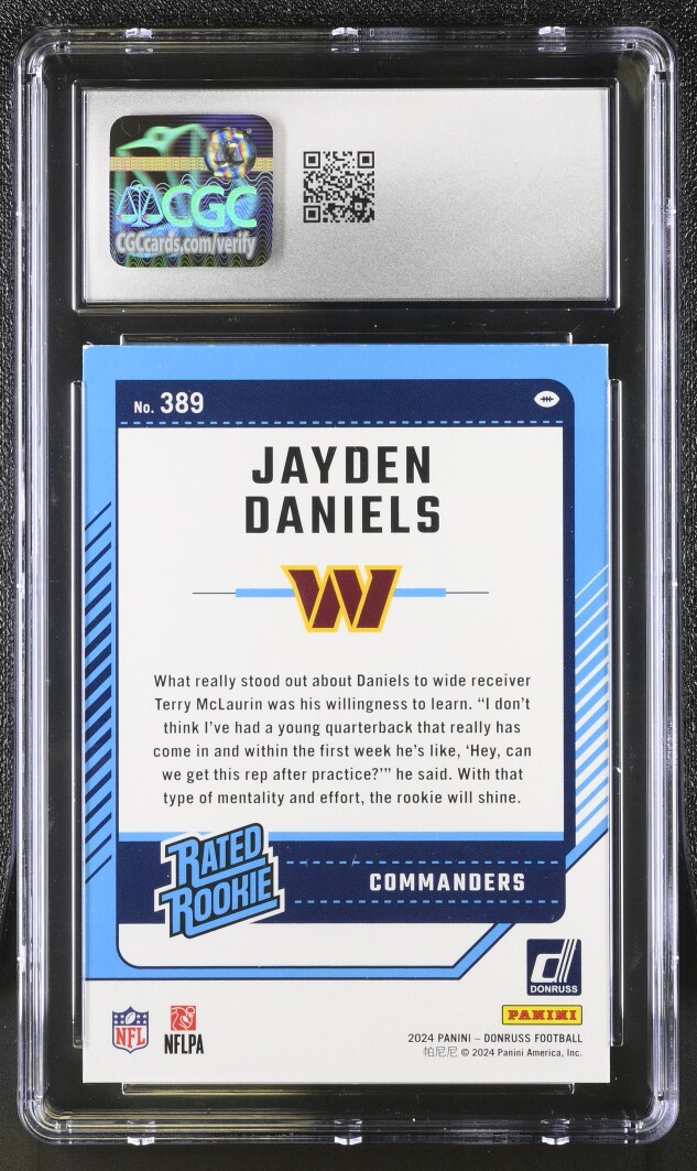You are purchasing a 2024 Donruss Jayden Daniels #389 Rated Rookie RC CGC 8. Thank you for looking.