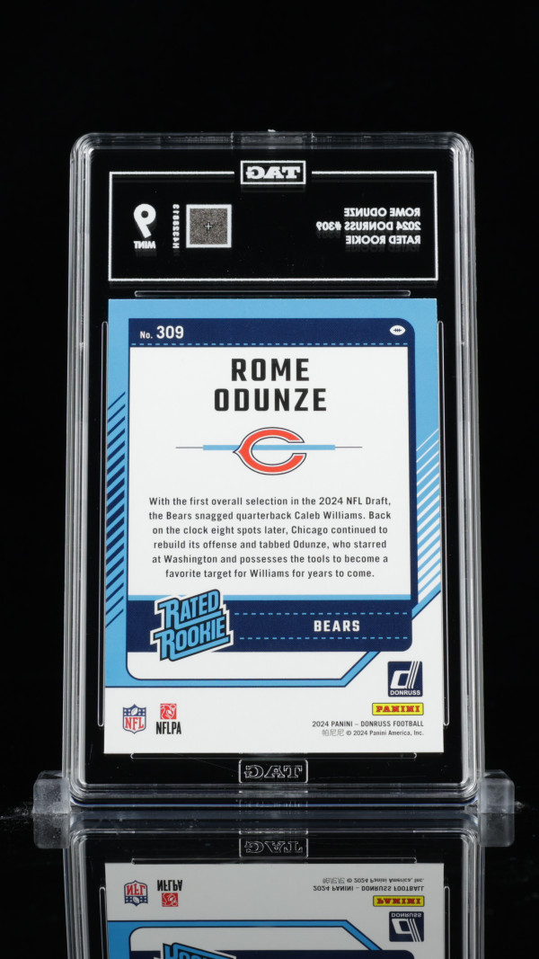 You are purchasing a 2024 Donruss Rated Rookie Rome Odunze #309 Rookie TAG 9. You will receive the exact item in the photographs. Thank you for looking.