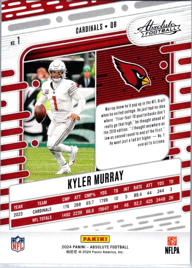 This is a nice example of a 2024 Panini Absolute #1 Kyler Murray