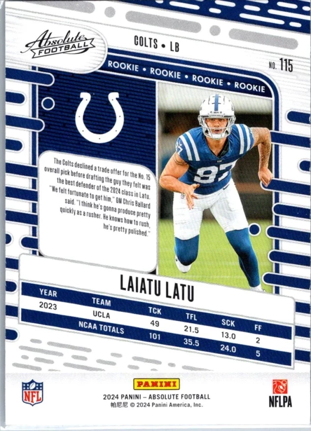 This is a nice example of a 2024 Panini Absolute #115 Laiatu Latu Retail