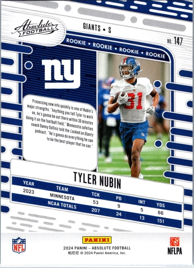 This is a nice example of a 2024 Panini Absolute #147 Tyler Nubin Retail