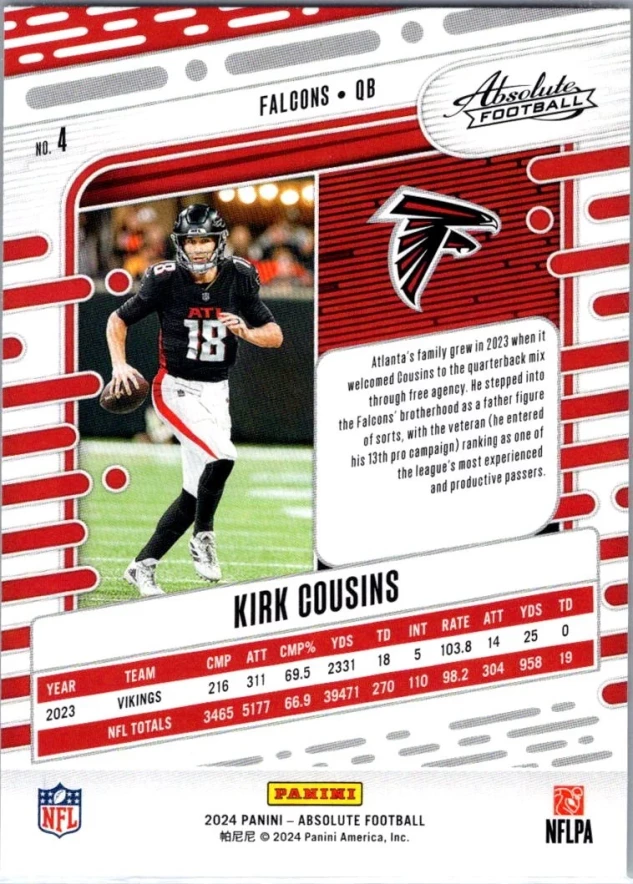 This is a nice example of a 2024 Panini Absolute #4 Kirk Cousins Retail