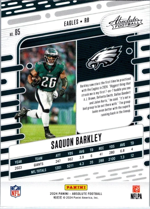 This is a nice example of a 2024 Panini Absolute #85 Saquon Barkley Retail