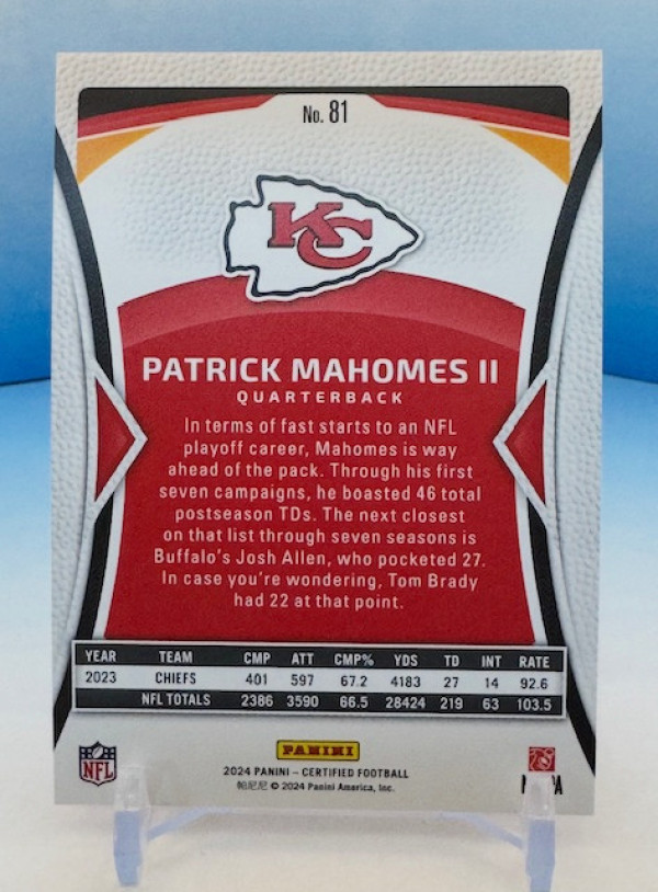 You are purchasing a 2024 Panini Certified Patrick Mahomes II Patrick Mahomes #81 Mirror Orange Parallel/Variety Base Set Panini Authentic. You will receive the exact item in the photographs. Thank you for looking.