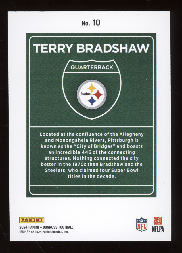 You are purchasing a 2024 Panini Donruss Football Downtown Terry Bradshaw #10. You will receive the exact item in the photographs. Thank you for looking.