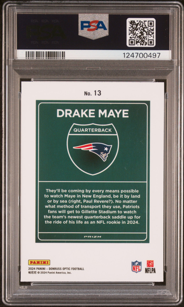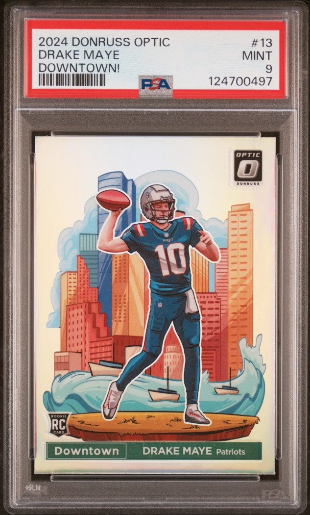 Beautiful RC Downtown of Drake Maye in a PSA 9🔥. One of the biggest young stars in the NFL. Grab this card and sit on it for 2-3 years and double or triple your value!