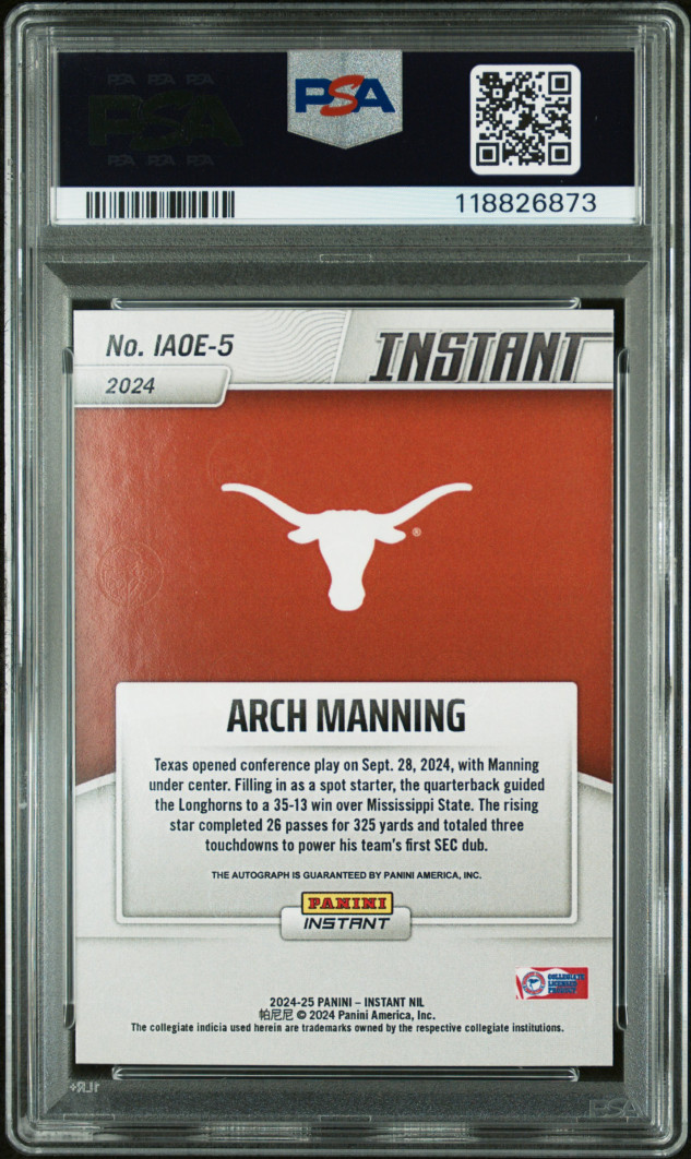 You are purchasing a 2024 Panini Instant Nil College Football Open Edition Autographs Arch Manning #IAOE5 PSA 9 Auto 9. You will receive the exact item in the photographs. Thank you for looking.