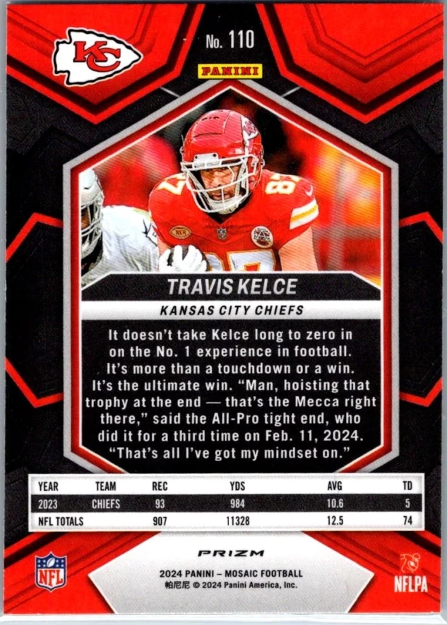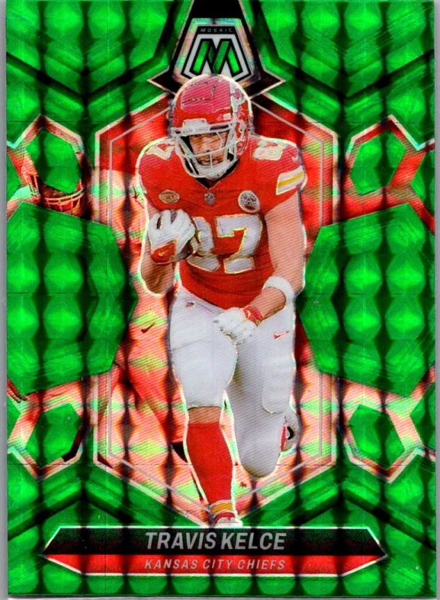 This is a nice example of a 2024 Panini Mosaic #110 Travis Kelce Mosaic Green