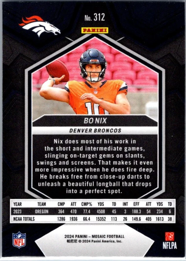 This is a nice example of a 2024 Panini Mosaic #312 Bo Nix