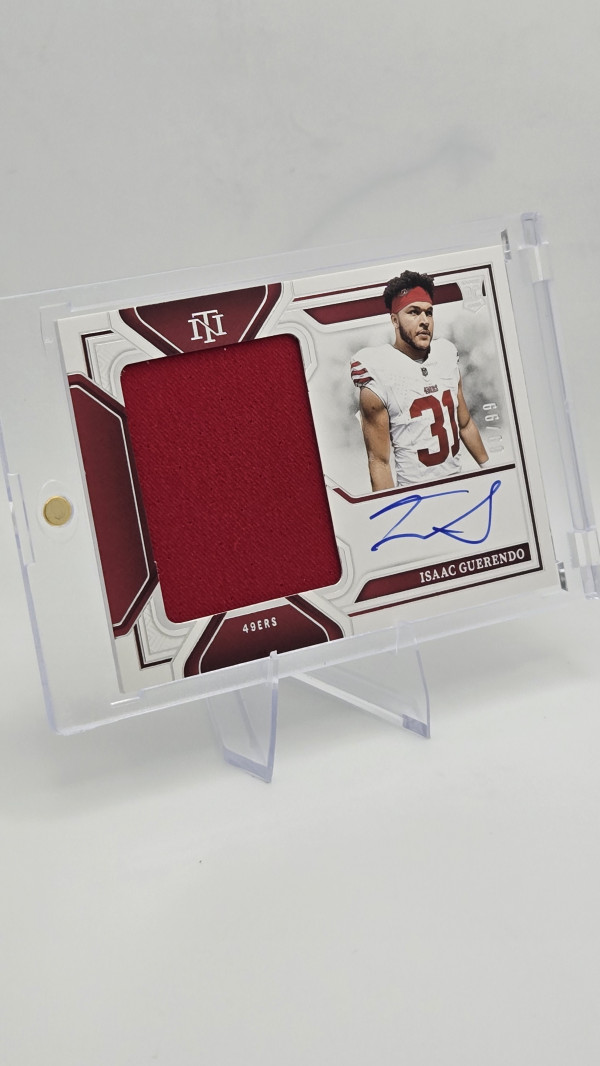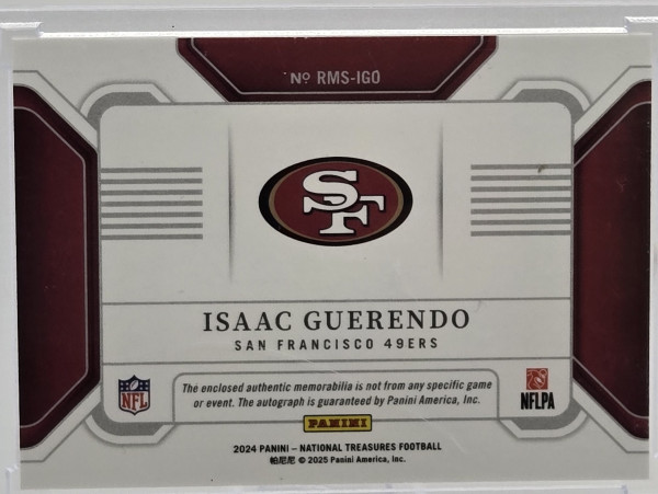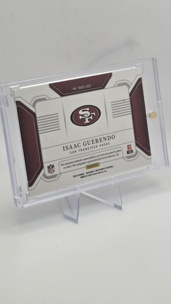 The 2024 Panini National Treasures Isaac Guerendo Rookie Patch Autograph trading card is a highly sought-after collectible for football fans and collectors alike. With only 99 copies in existence, this limited edition card features a unique patch from the rookie player, Isaac Guerendo, who is a part of the San Francisco 49ers. Authenticated by Panini, this special card is a must-have for any fan of the National Football League looking to add a rare and valuable piece to their collection.