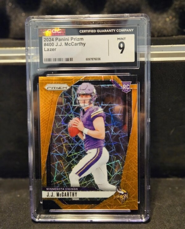 The 2024 Panini Prizm J.J. McCarthy #400 Lazer Prizm (RC) is a key rookie card for the Minnesota Vikings quarterback. In a PSA 9 (Mint)