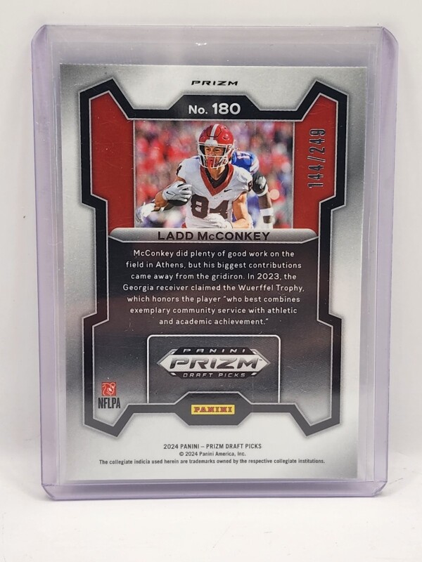 The product is a 2024 Panini Prizm Draft Picks trading card featuring Ladd McConkey from the Georgia Bulldogs. This specific card is a Blue Wave Prizm parallel, numbered out of 249, making it a rookie card (RC) from the National Collegiate Athletic Association (NCAA) league. The card is part of the base set for the 2024 season and manufactured by Panini. It is a standard-sized sports trading card made with a 20 Pt. thickness, perfect for football enthusiasts looking to add a unique and collectible item to their collection.