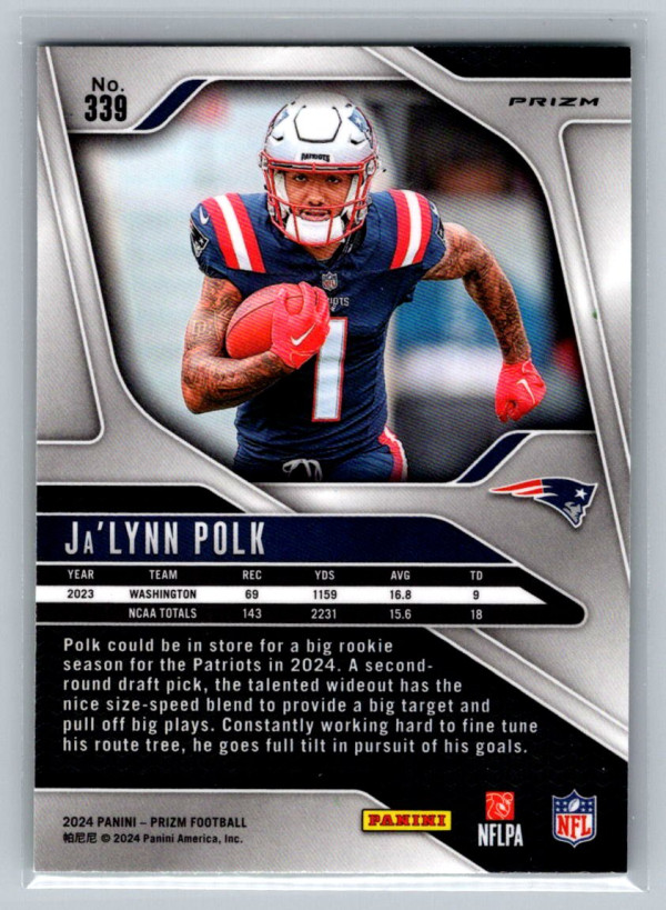 You are purchasing a 2024 Panini Prizm Ja'Lynn Polk #339 Green Rookie New England Patriots. You will receive the exact item in the photographs. Thank you for looking.