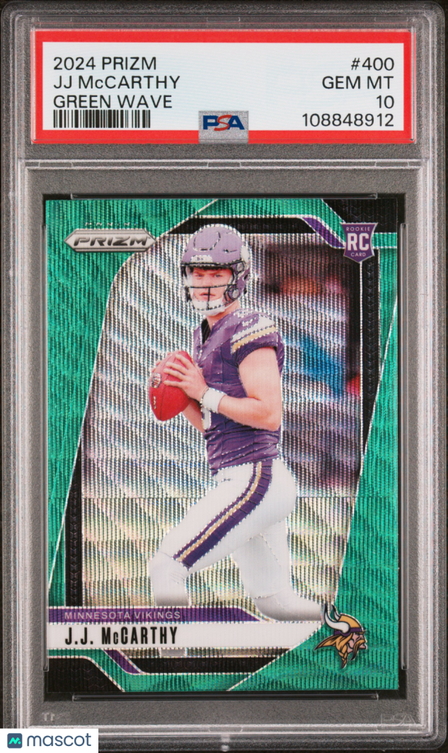 Up for grabs is a stunning 2024 Panini Prizm JJ Mccarthy #400 Green Wave parallel, professionally graded PSA 10—truly the best of the best for any serious Minnesota Vikings or NFL collector! With zero cards graded higher and only 232 in the population, this gem is a must-have investment piece and a standout addition to any football card collection. Secure this rare card today and celebrate JJ Mccarthy’s rookie year with one of the most sought-after Prizm releases of the season!