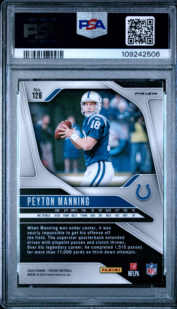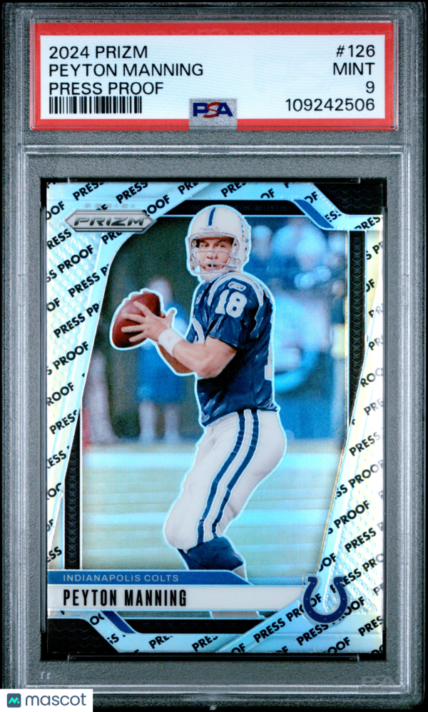 You are purchasing a 2024 Panini Prizm Peyton Manning #126 Press Proof PSA 9. You will receive the exact item in the photographs. Thank you for looking.