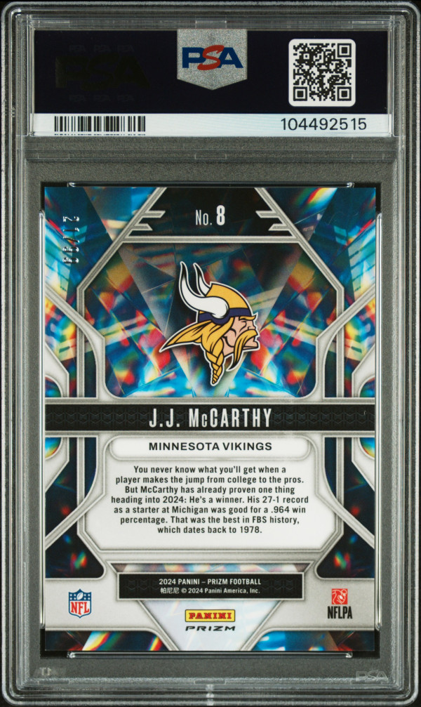 You are purchasing a 2024 Panini Prizm Prizmatic JJ Mccarthy #8 Blue Ice PSA 10. You will receive the exact item in the photographs. Thank you for looking.