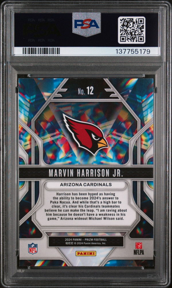 You are purchasing a 2024 Panini Prizm Prizmatic Marvin Harrison JR. #12 PSA 9. You will receive the exact item in the photographs. Thank you for looking.